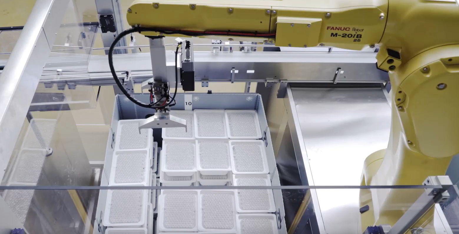 ...Our PT1/PT2 robotic packer is equipped with a Fanuc robot and offers one or two palletizing zones depending on your needs.